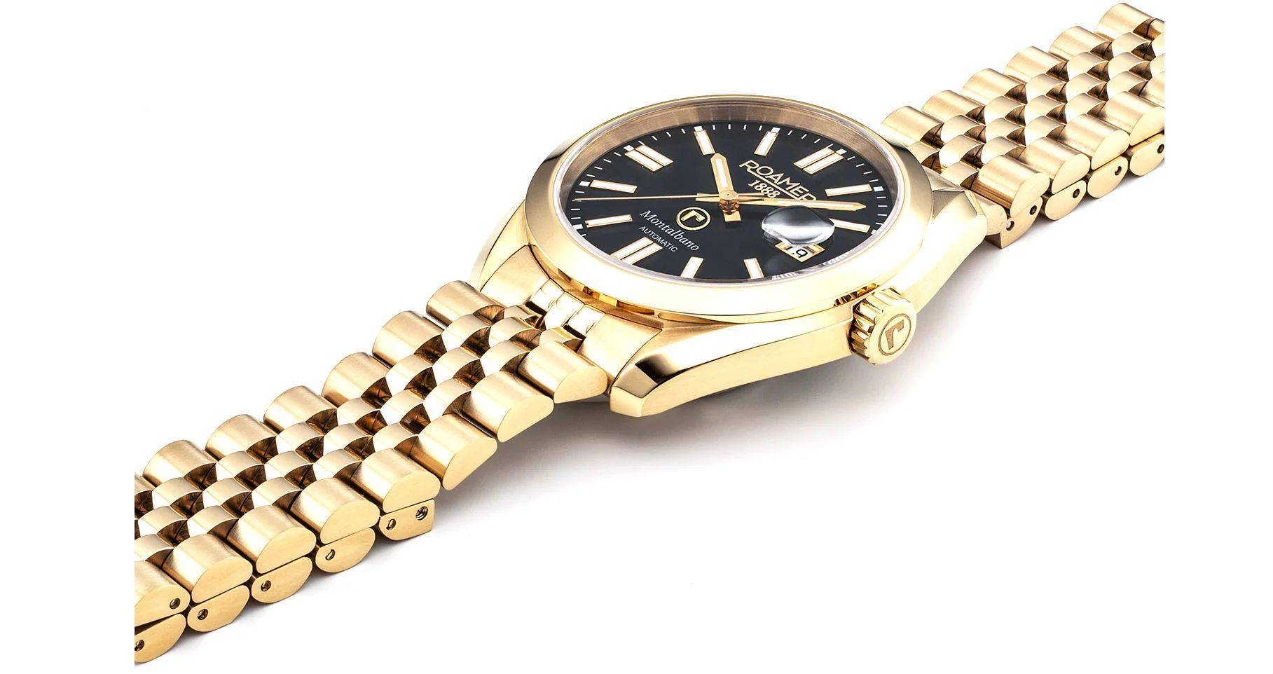 Az óra legmeghatározóbb vizuális eleme a teljes arany színű tokozás és fémcsat, amely egy meleg, klasszikus gazdagságot sugároz. Ezt a csillogást tökéletesen ellensúlyozza és kiemeli a mélyfekete számlap. Ez a színkombináció a férfidivatban évtizedek óta a siker és a magabiztosság szimbóluma, amely azonnal odavonzza a tekintetet anélkül, hogy túldíszített lenne.