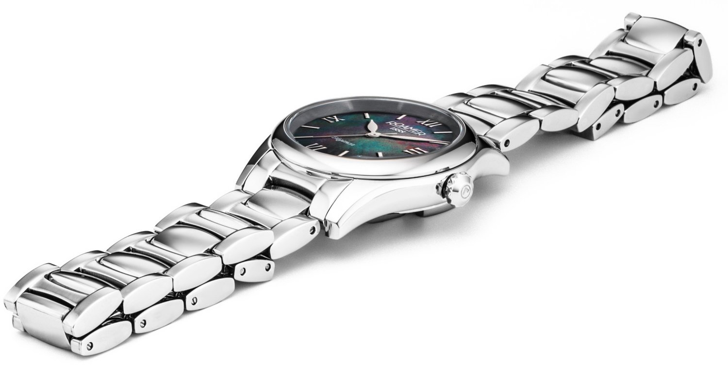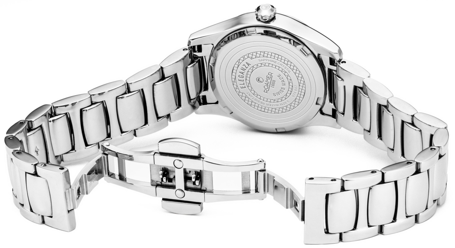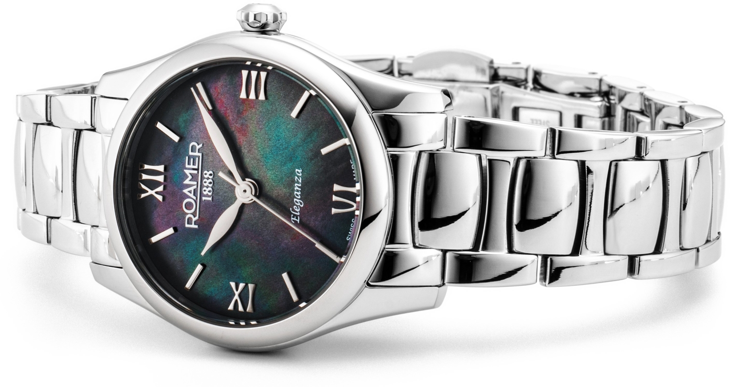 A Roamer Eleganza egy ízig-vérig klasszikus svájci ékszeróra. Az ezüstszínű, minőségi acéltok és fémcsat eleganciáját a sötét gyöngyház számlap teszi igazán különlegessé és titokzatossá. Tökéletes választás azoknak a nőknek, akik szeretik a prémium „Swiss Made” minőséget, és egy olyan kifinomult, karcálló órát keresnek, amely önálló ékszerként is megállja a helyét bármilyen elegáns eseményen.