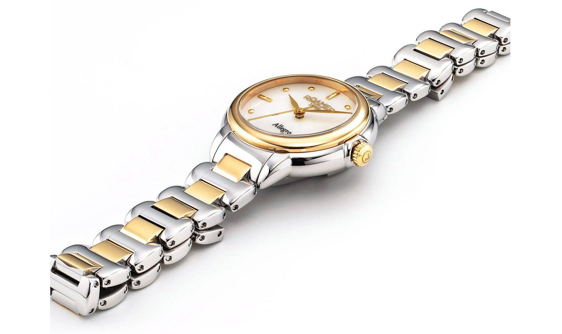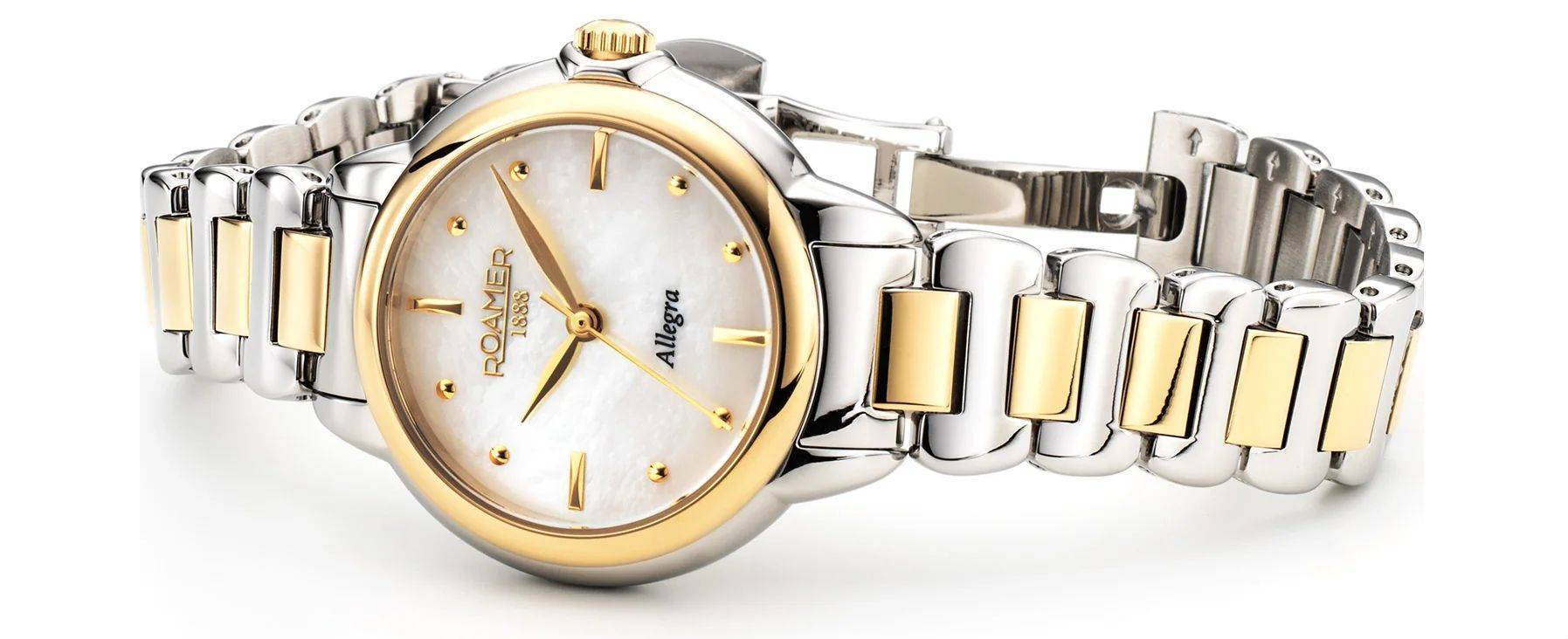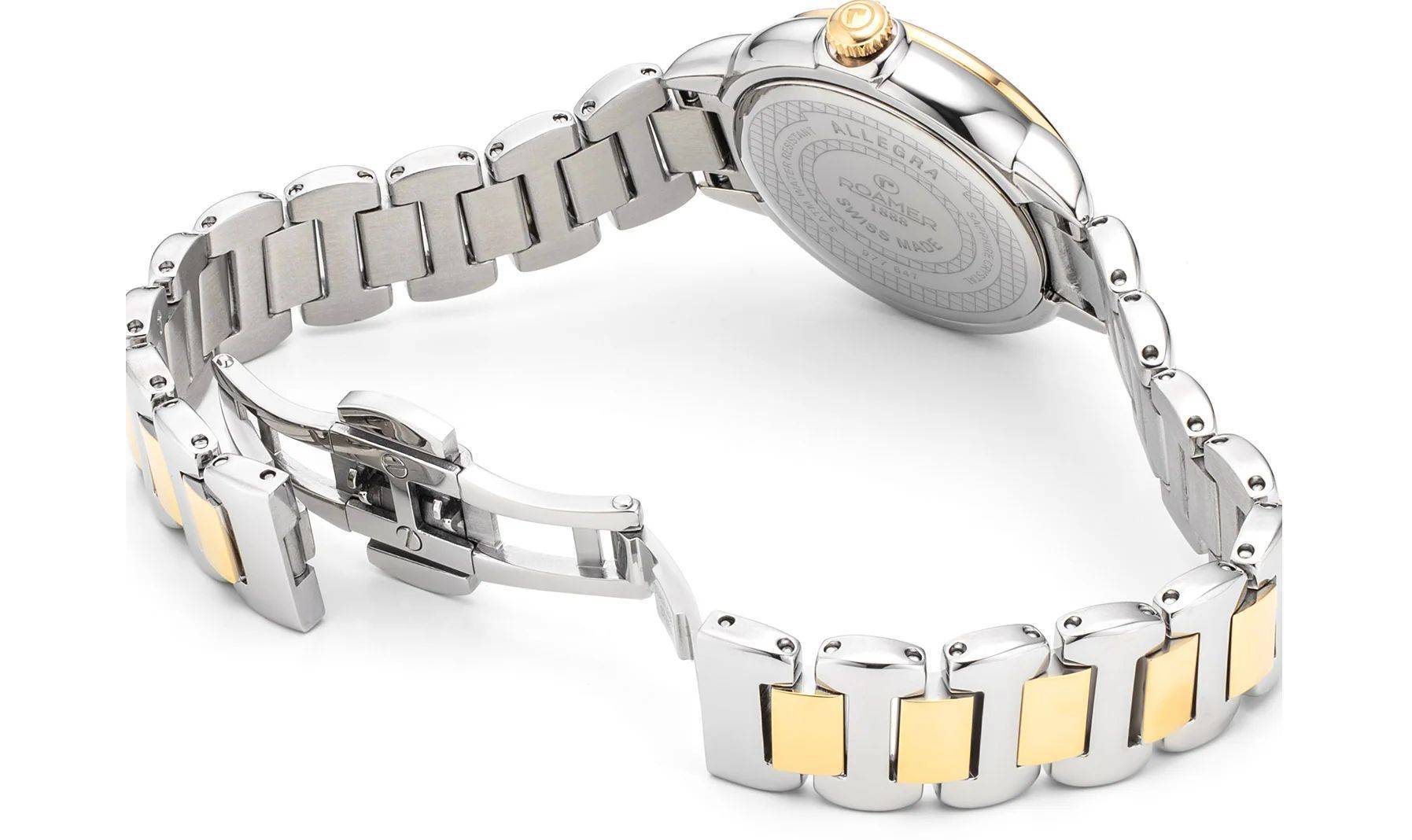 A Roamer Allegra ezen modellje egy kifejezetten nőies, klasszikus svájci ékszeróra. A bicolor (ezüst-arany) kivitel és a gyöngyház számlap eleganciája tökéletes választássá teszi a mindennapokra és a hivatalos alkalmakra is. Mivel a vízállósága 30 méter, egyértelműen divatóraként/dressz óraként érdemes rá tekinteni, amit óvni kell a nagyobb mennyiségű víztől.