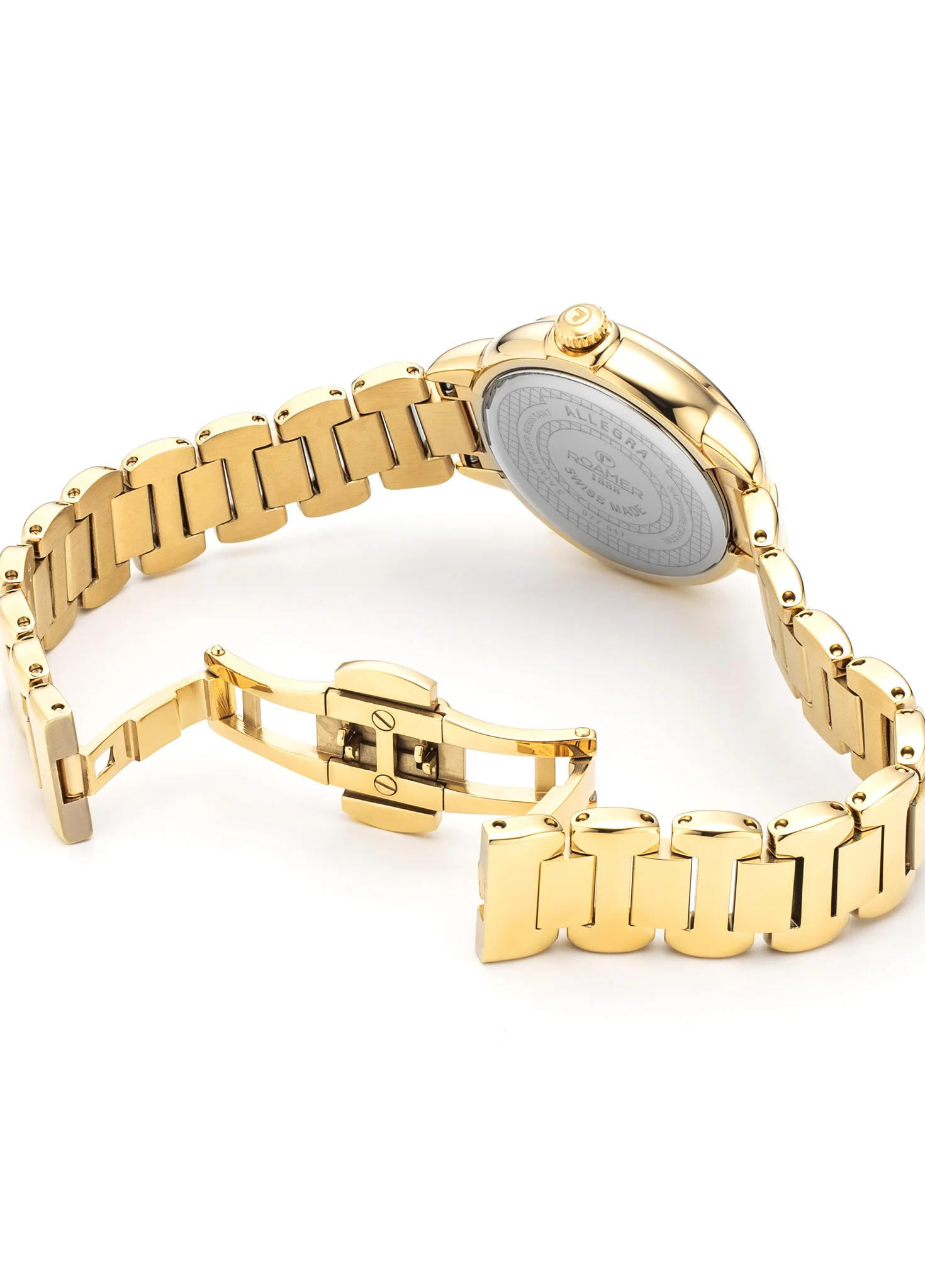 A Roamer Allegra ezen modellje a meleg, tradicionális sárgaarany klasszikus vonzerejét ötvözi a természetes gyöngyház számlap lágyságával. Ideális választás, ha egy időtálló, feltűnő, de nem túlméretezett „Swiss Made” órát keresel, ami önálló ékszerként is öltöztet.